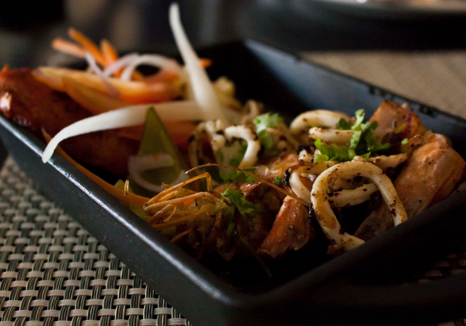 | Lekko pikantna krewetka o bogatym smaku kuminu i kolendry. Do tego kluska z tapioki z czarną gorczycą i odrobina sosu na bazie mleka kokosowego. |